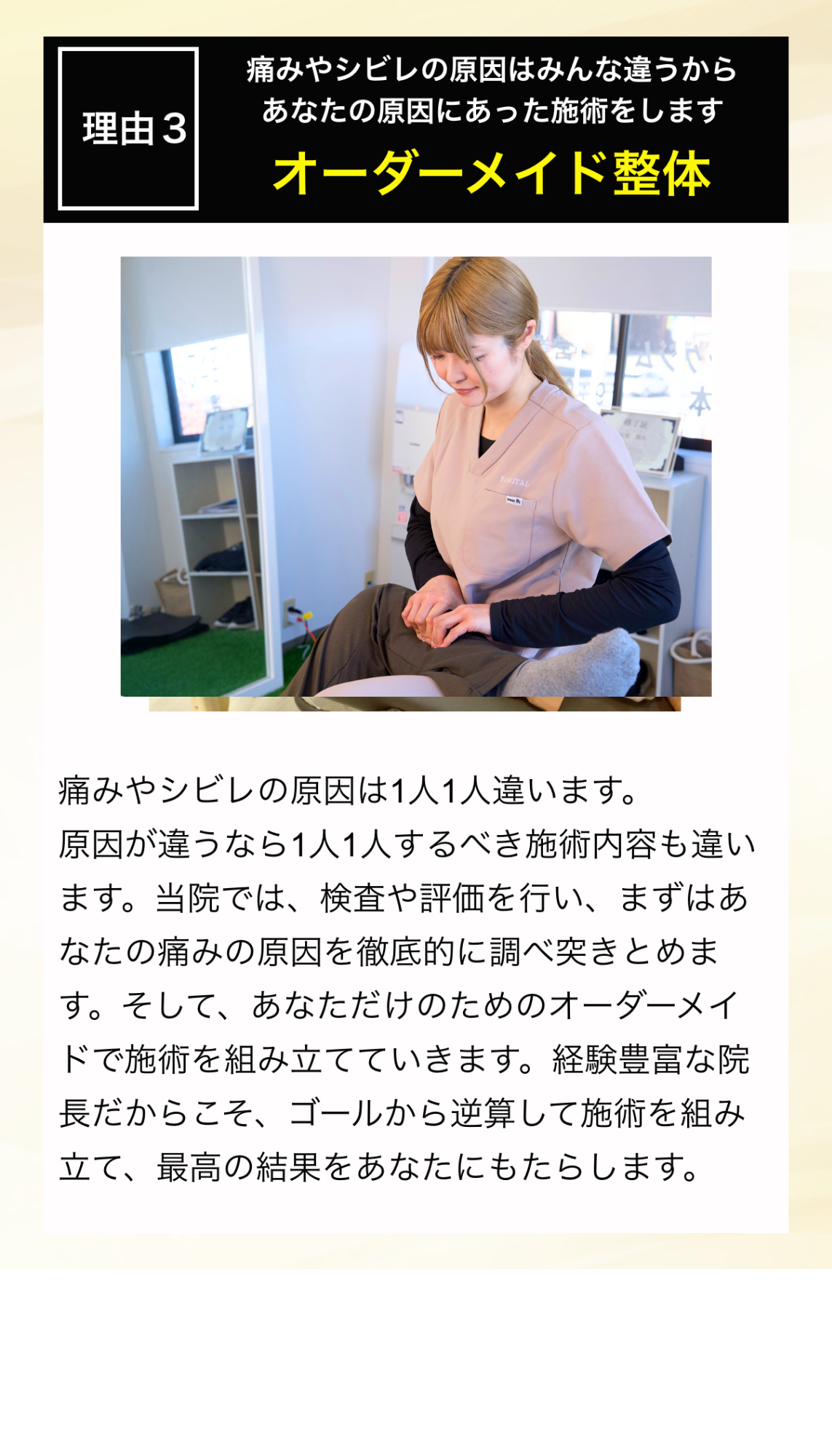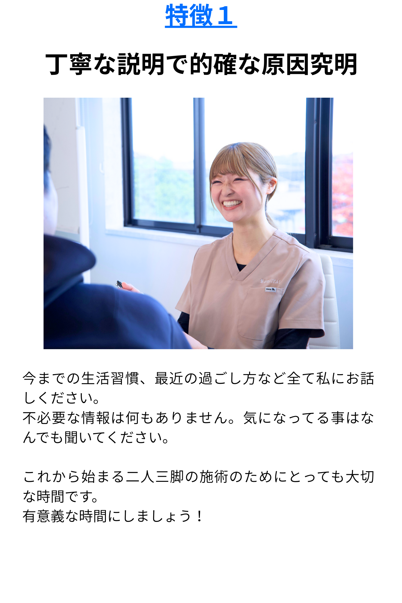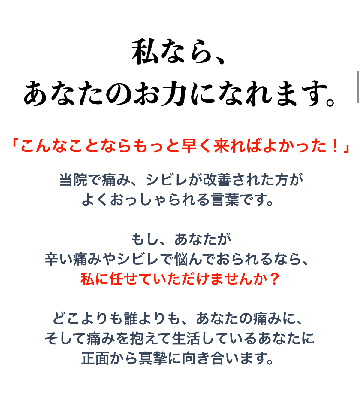 2つ目は、初回の施術を試していただければ、根本的に「改善できるんじゃないか」とあなたに可能性を感じてもらえると自信があるからです。