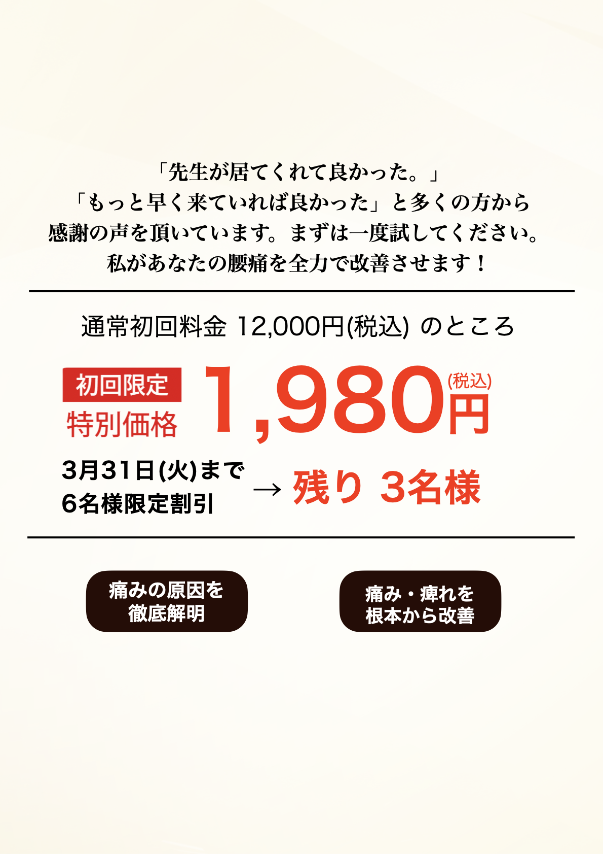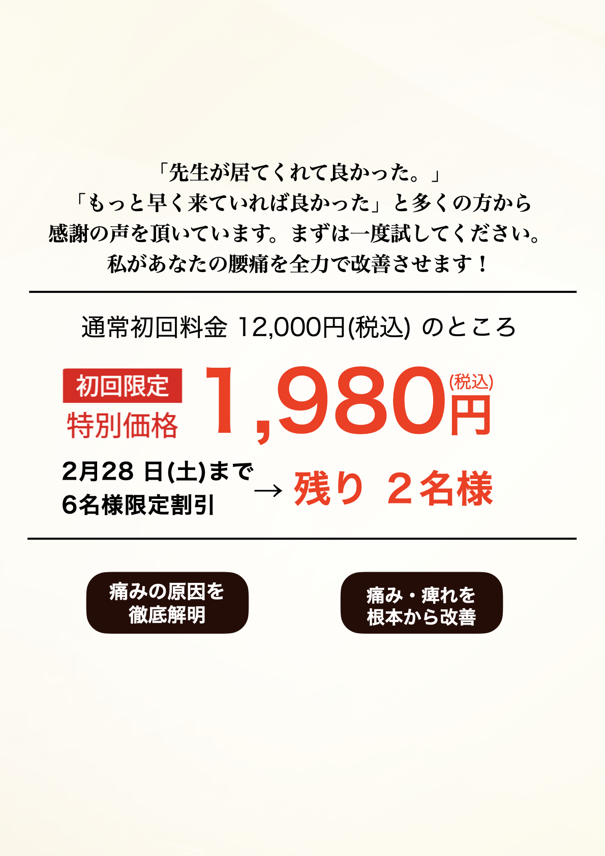 1つ目は、あなたの痛み・シビレが改善するんだということを知ってほしいからです。整形外科に行って薬と湿布をしても改善しない、整骨院に行ってもその場はいいけど、ぶり返す。自分の腰痛はもう改善しないと諦めているあなたに、ちゃんと改善できることをまずは知ってほしいのです。ですが、施術を受けてもらえないとその良さも分かりません。なので、初回安くさせてもらって、試しやすいようにさせてもらっています。