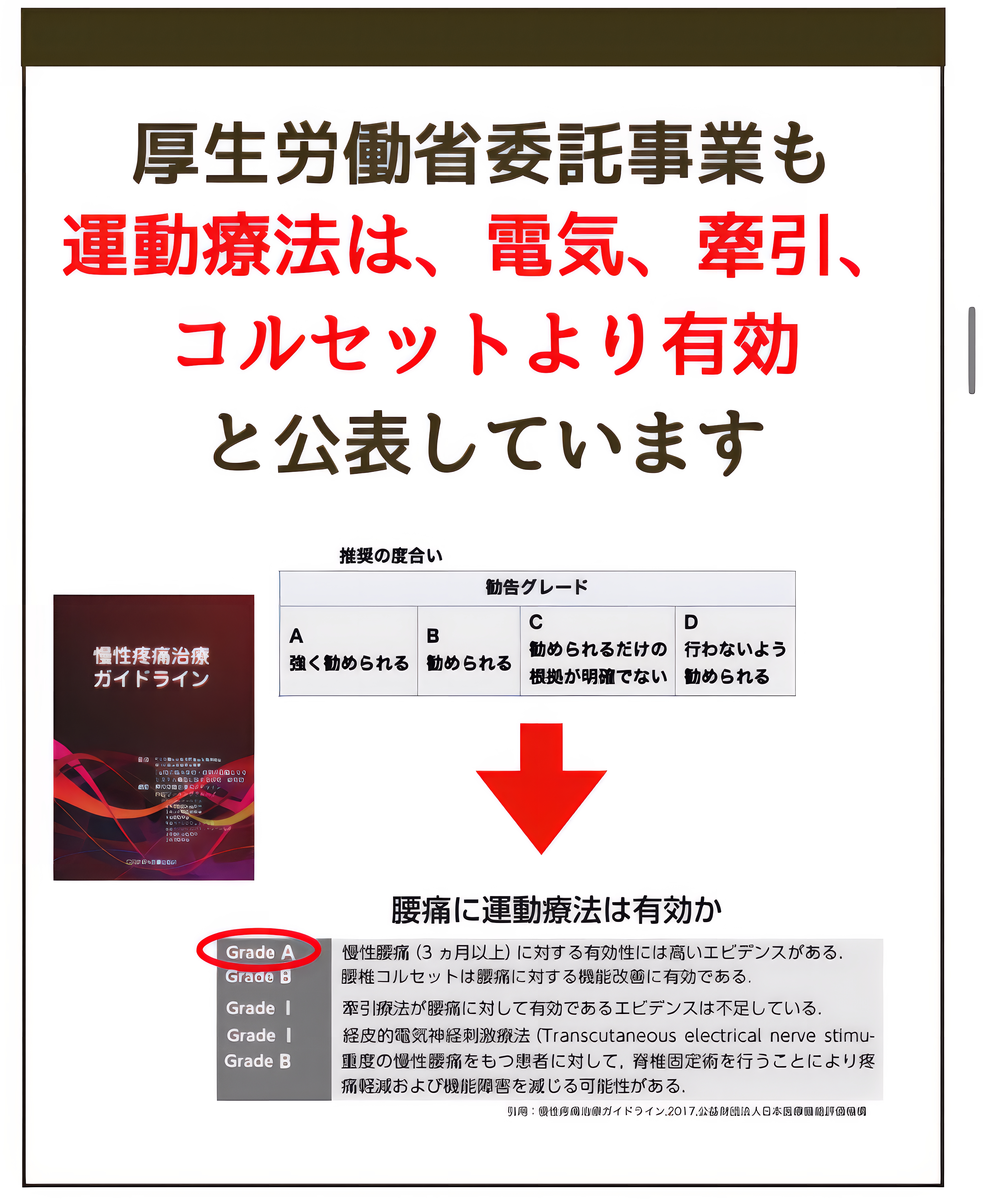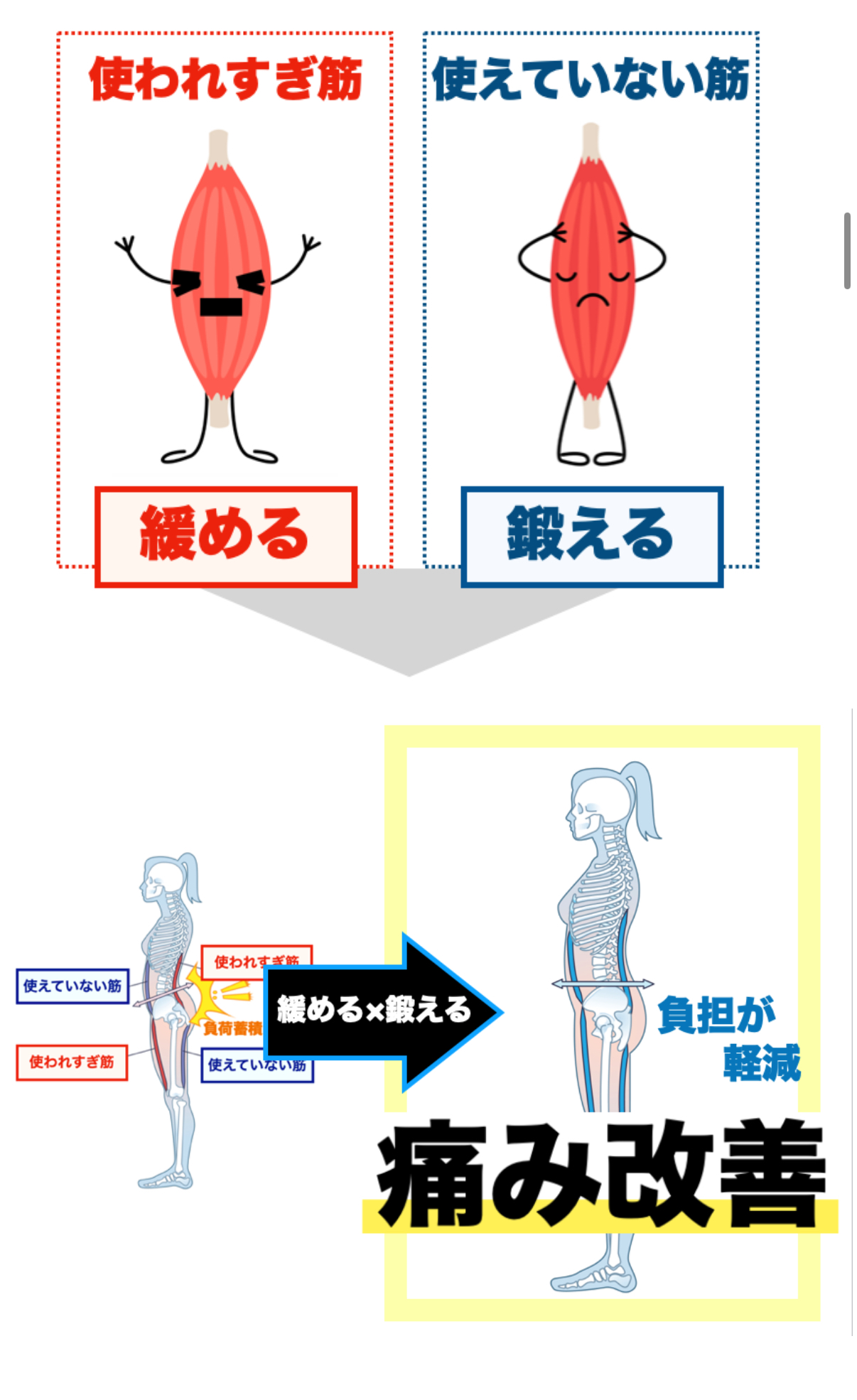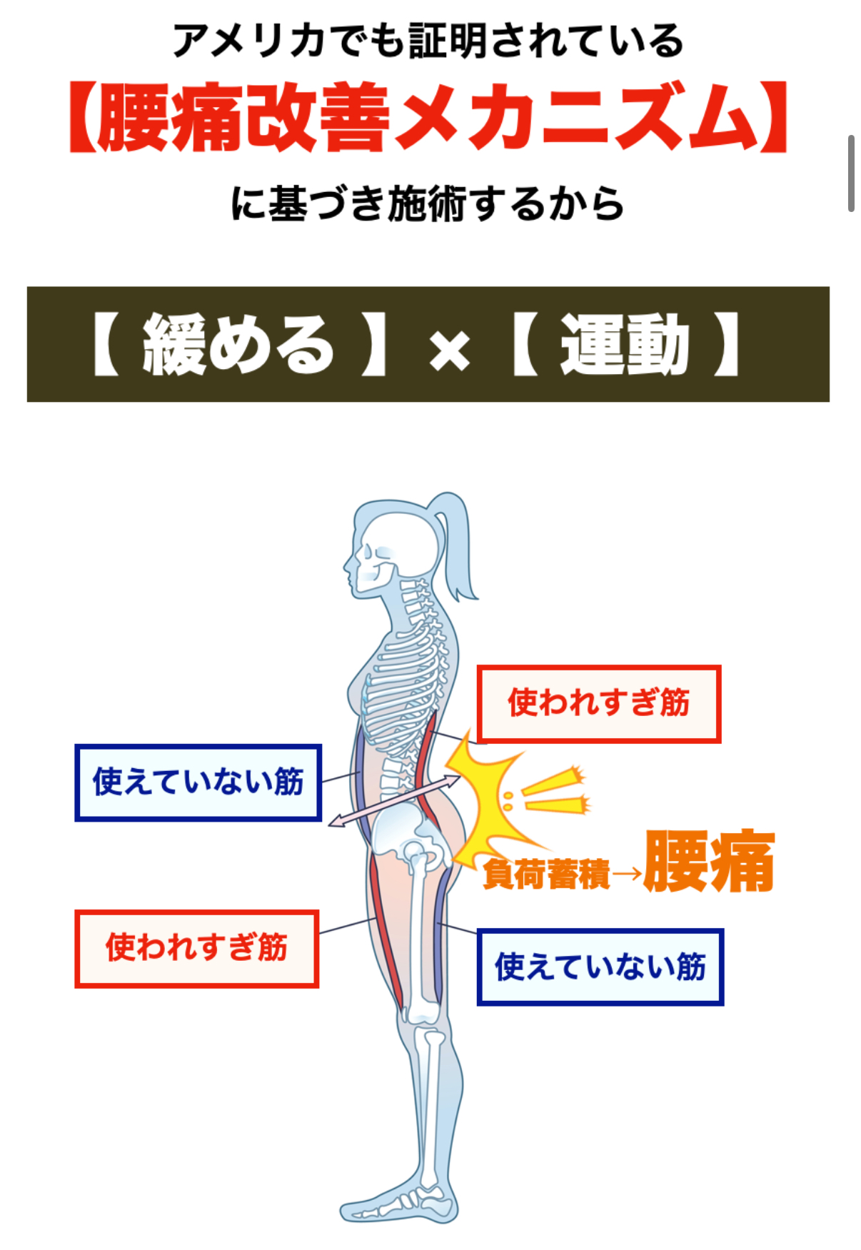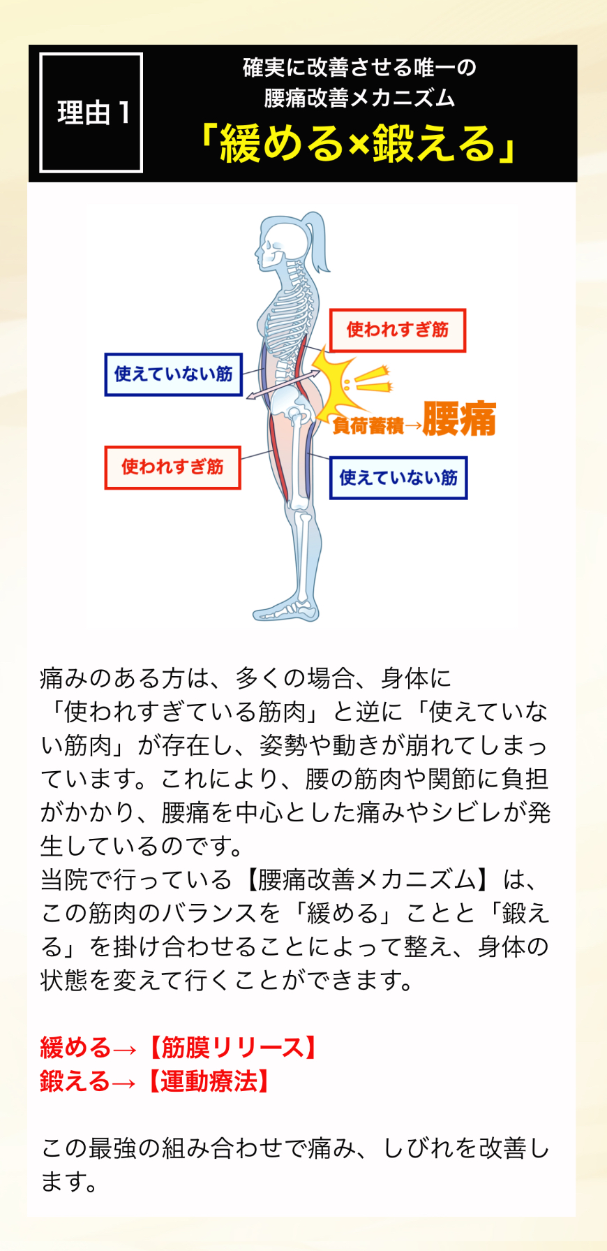 当院で行っている【腰痛改善メカニズム】は、この筋肉のバランスを「緩める」ことと「運動」を掛け合わせることによって身体を整えていきます。